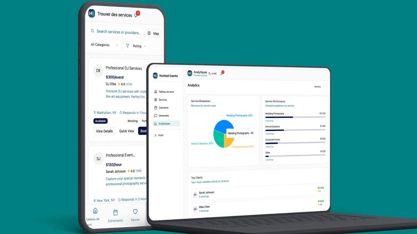 Avec Hunteal, trouvez en quelques clics des professionnels de confiance pour donner vie à vos événements. Simple, rapide et efficace, notre plateforme vous connecte aux talents qu’il vous faut pour créer des moments inoubliables.